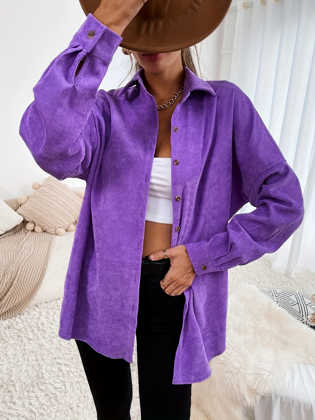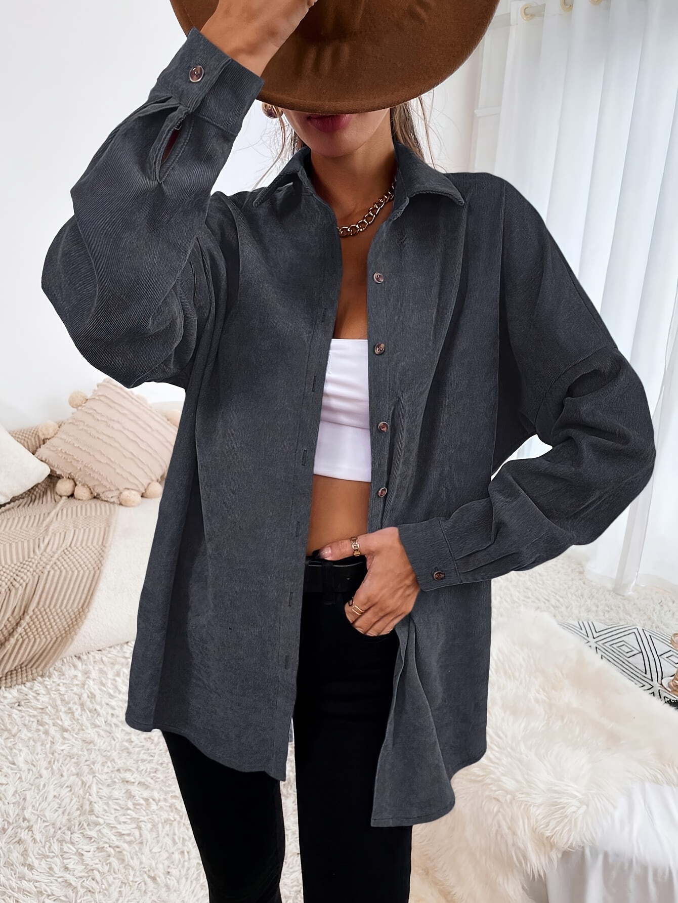 1pc Elegant Solid Color Corduroy Drop Shoulder Long Sleeve Shirt for Women, Polyester, Button-Up Front, Spring/Autumn Season, Adult Casual Loose Fit Top