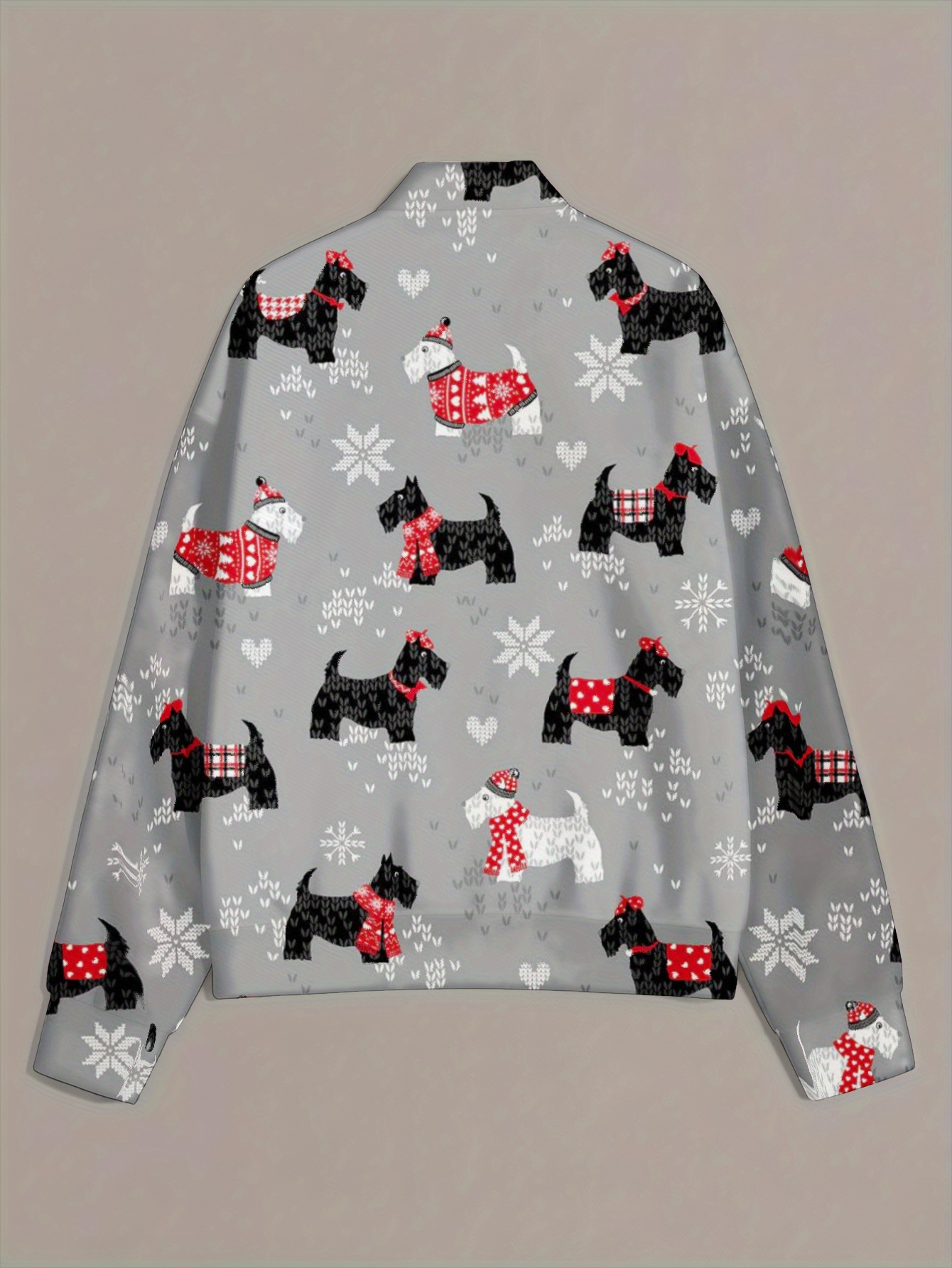 Plus Size Woman's Christmas Scottish Terrier & Snowflake Print Jacket - Winter Dog Coat with Button Front, Machine Washable Polyester Outerwear for Holiday Parties & Cold Weather