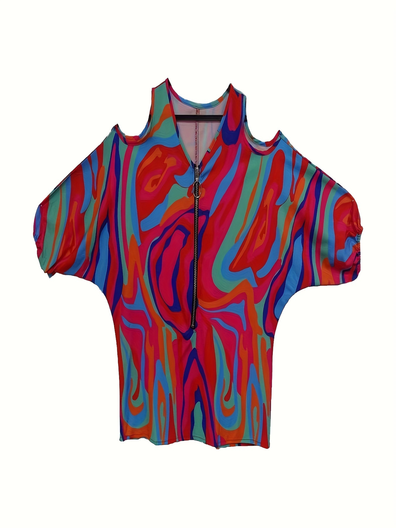 Ladies' printed off shoulder V-neck zipper lantern top T-shirt