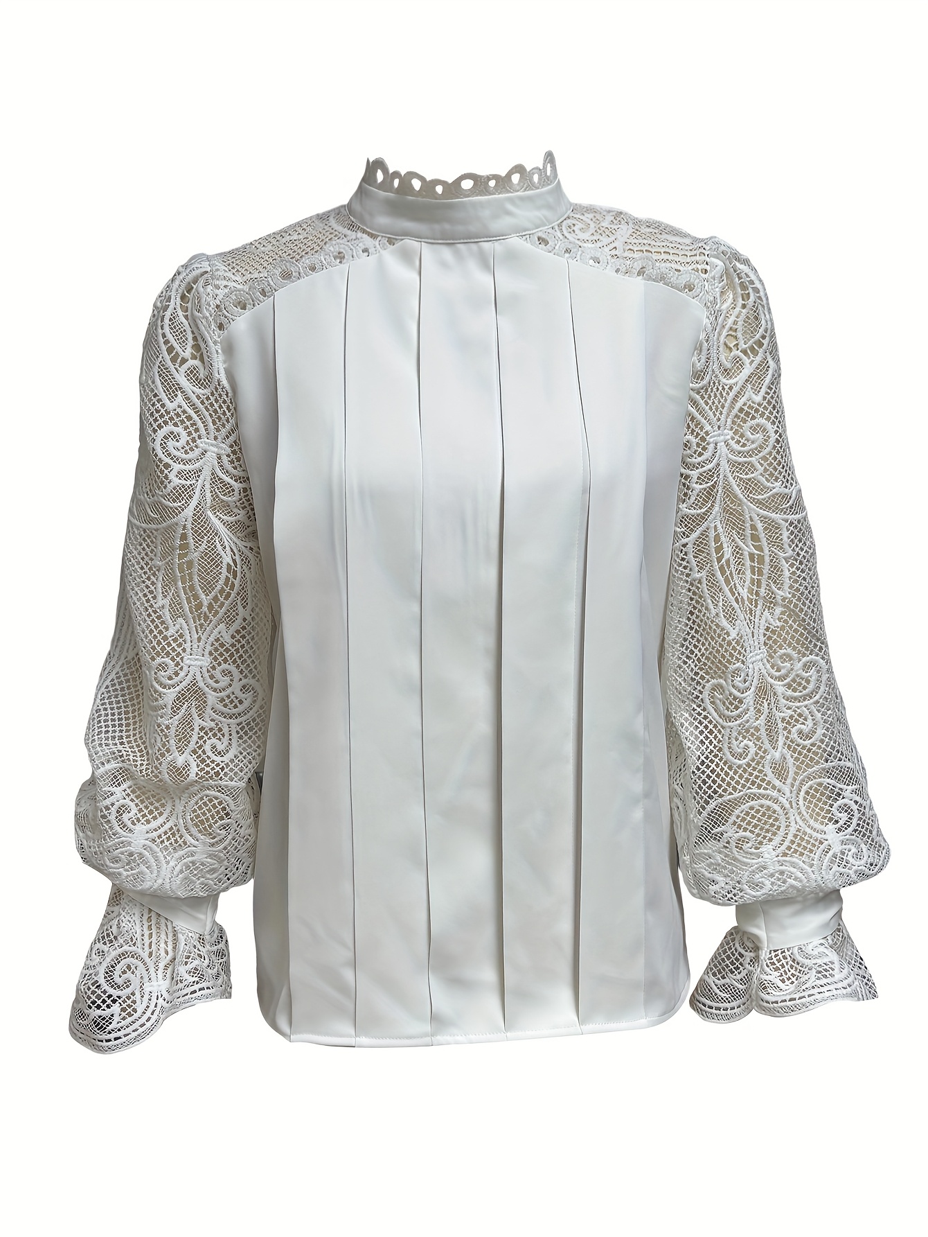 Women'S Elegant Lace-Trimmed Blouse with Puff Sleeves & High Neck - Chic White & Beige Contrast Design, Perfect for Spring/Summer/Fall, Versatile Fashion Top, Spring Summer Fashion, Sophisticated Style, Intricate Lace Detailing
