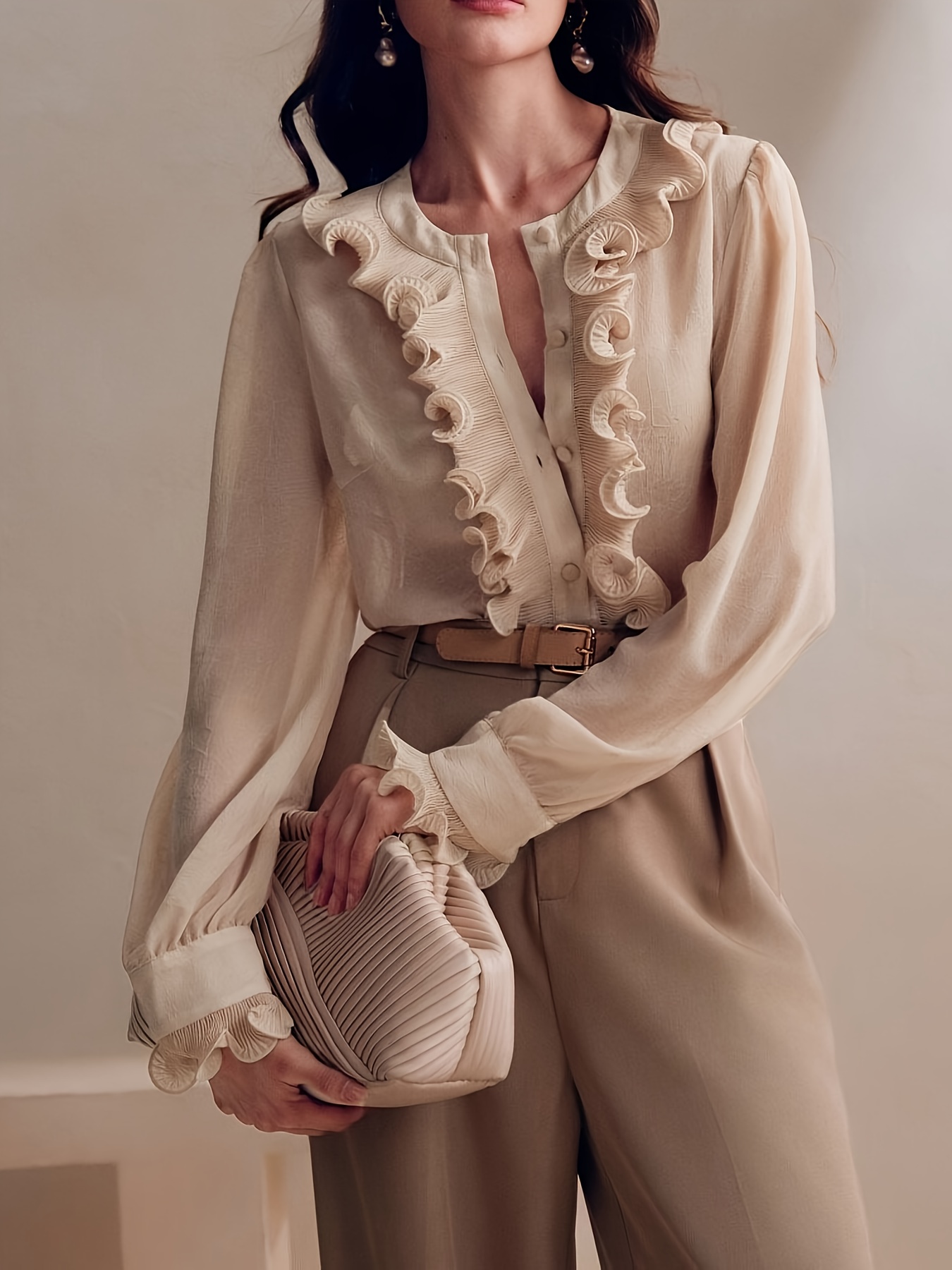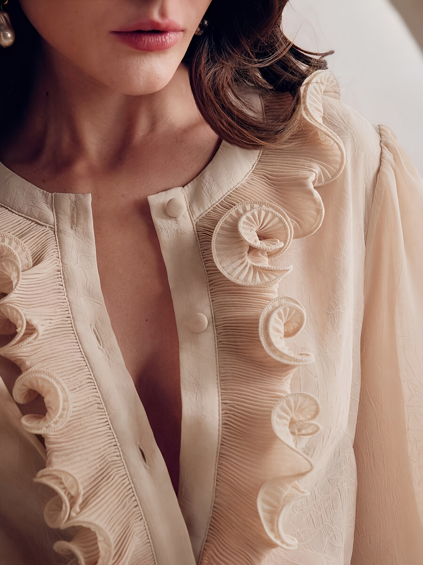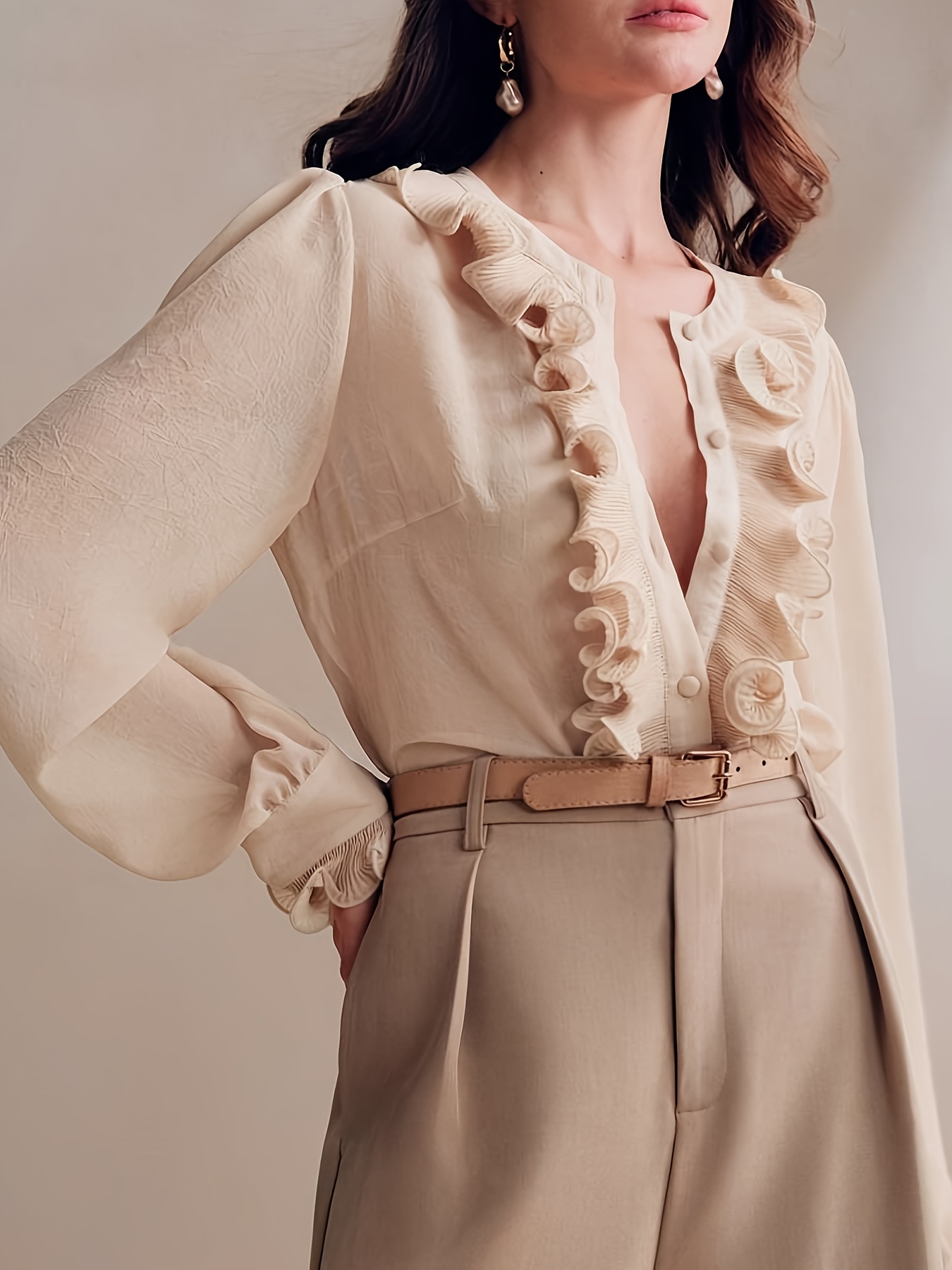 Women'S French-Inspired Elegant Long Sleeve Shirt with Ruffled Cuffs - Round Neck Pleated Design, Lightweight Beige Blouse for Spring Summer Fall, Versatile for Valentine'S Day, Vacation & Business Casual Outfits, Vacation Clothing, Soft Texture Top